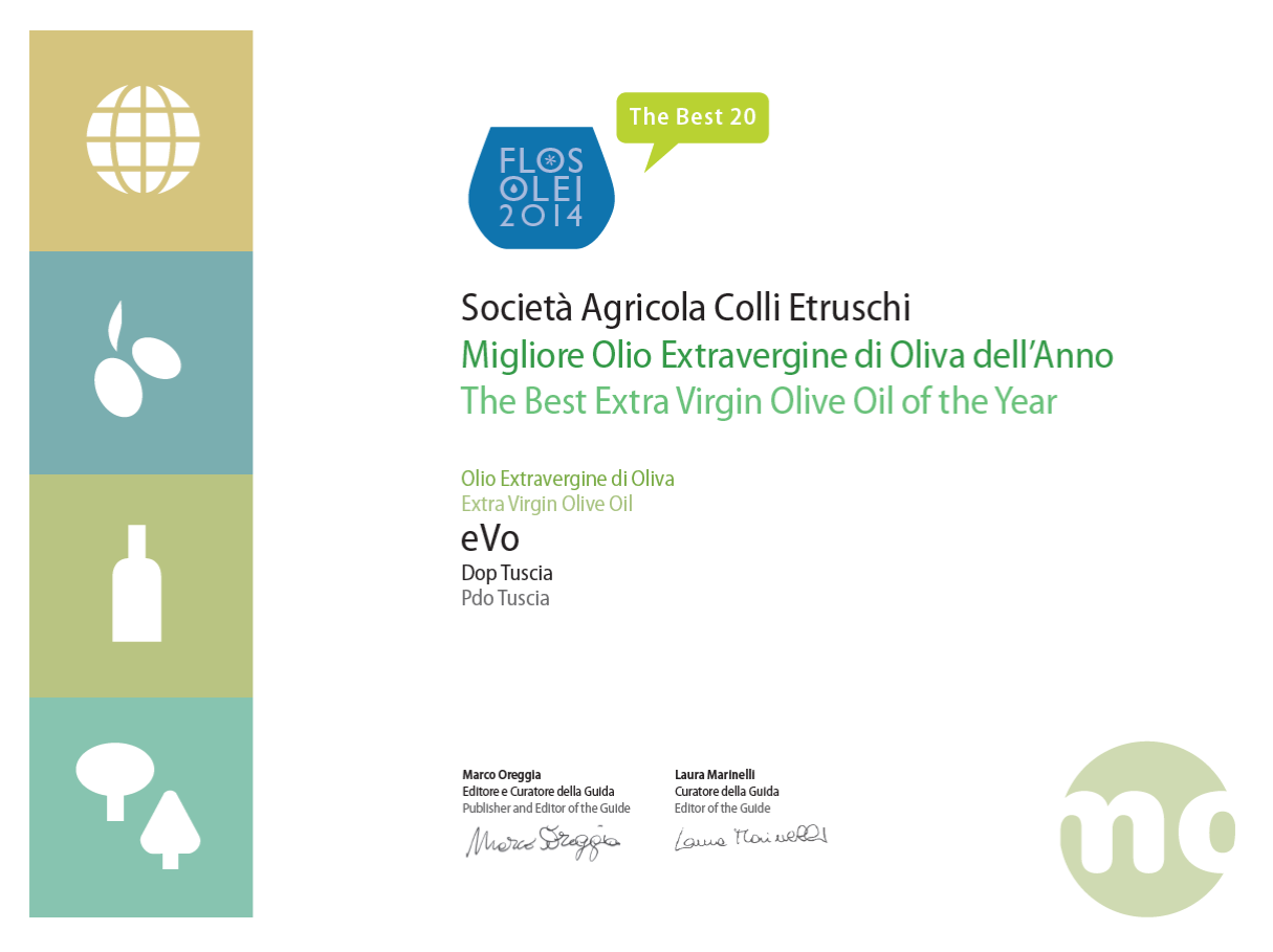Personalitate puternică, perla Colli Etruschi este un ulei de măsline bogat în polifenoli, cu gust distinct și premii pe măsură: Cel mai bun ulei de măsline extravirgin din lume, Flos Olei, 2014 și Cel mai bun ulei D.O.P. din Italia, Gambero Rosso, 2023. Intens, cu note de iarbă proaspăt cosită, anghinare, verde crud astringent, piperat și catifelat, exprimă puterea naturii. Îmbogățește orice atinge, legumele verzi și saute, peștele crud ori rumenit, pastele fierbinți cu pecorino, vlăstarii, sincerele roșii cu brânză sau pâinea proaspătă înmuiată în el.
